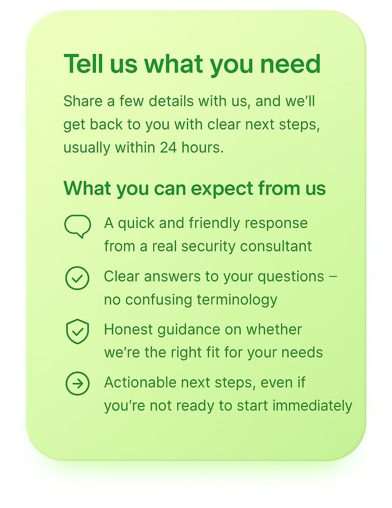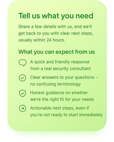 Whether you’re preparing for an audit, improving your security posture, or looking for clarity on your current risks, we’re here to help. No jargon. No pressure. Just straightforward guidance from people who’ve been doing this for years